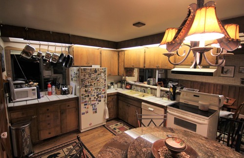 Opposite the Living Room is our Dining Area with a hardwood table that comfortably seats 8-10 guests, and can also be used for work, study, or after-dinner board games only a few feet away from (but still near) those guests who prefer to read, converse, or watch a movie in front of the fire.