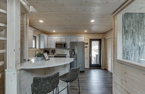 The tree house includes a granite kitchen dinette, living room with plenty of natural lighting, bathroom, loft and a bedroom. Fun and unique design features include a covered back private deck, dramatic loft design, and expansive windows to take in the bird's eye view.