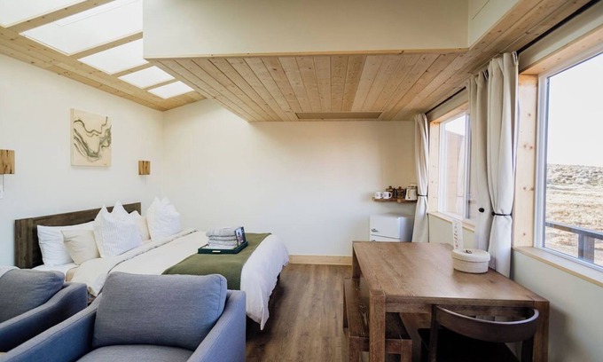 Our custom made casita has been thoughtfully built and designed by us for those looking for that extra glamping comfort. 8 skylights line the roof to make the most of sky watching and stargazing. Our only solar powered unit has AC/heat, outlets, a mini fridge and a kettle. This unit can sleep up to 4 guests with a king bed, a queen bed in the loft, a cozy couch, large dining table and large windows. Adirondack Chairs, hammock swings and a porch swing wrap around the 3 sides of the private deck.