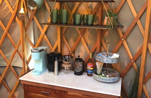 Coffee bar area has whatever you need for your coffee preference: keurig brewer with included coffee pods, french press brewer, pour over brewer, hand-powered grinder, scale, kettle, and the fixins like cream, sugar, syrup, etc. If you`re going to go the `manual` brewing route, BE SURE TO REQUEST COFFEE BEANS FROM US! Organic teas for the non-coffee folks :). R/O filtered water for brewing/drinking/cooking.