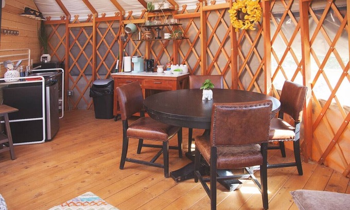 The yurt is an actual wood-framed tent, and if you`ve heard of `glamping` (glamorous camping), that`s what this is! While the yurt is a great shelter from the sun and the wind and most effects of the elements, the structure is not air tight and is subject to some fluctuations in temperature (though it has a large mini split a/c and heater to mitigate the temps), wind noise and occasional bugs :). So just so we`re all clear, the yurt is a true glamping experience!