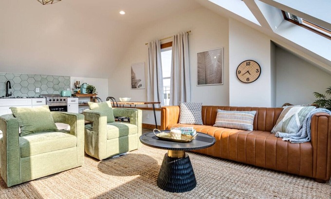 When you enter the property, you’ll be greeted by a penny tile mosaic with a very important message! 😉 Head up the stairs and emerge into a light-filled space with special details in every corner. You’ll love the open layout of the kitchen, dining and living room. Sink into the channeled leather sofa and take in the gorgeous view of the Indianapolis skyline. It’s even better at night!