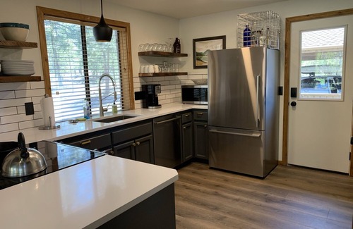 The expansive deck has two separate gathering areas. The hot tub location is private and perfect after a long day on the slopes or hiking in the Deschutes Forest. Bring your favorite grill items and enjoy the gas BBQ. Keeping snow off your ride in the winter and shaded in the summer is a double carport. Or, leave your car in the carport and hop on a bike and cruise down to the SHARC - 6 passes included!!!