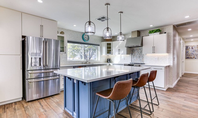 A living room, a fireplace, air conditioning, and a ceiling fan are featured at this 4-bedroom, 2-bathroom rental. Prepare a home-cooked meal in the kitchen, complete with an oven, a stovetop, and a dishwasher, as well as a coffee maker, a microwave, and cookware.