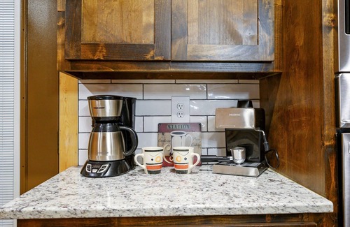 Next door, Sasquatch Hills offers a peaceful woodland retreat on a sprawling two-acre wooded lot. This 1,700 sq. ft. cabin blends rustic charm with modern luxury and features three bedrooms, including two king suites on the main floor and a large upstairs bunk room with its own ensuite bathroom. The bunk room is a guest favorite, featuring an arcade machine with 60+ games—perfect for kids and kids-at-heart.