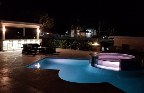 Amazing opportunity to live the dream aboard a 40 ft Italian Yacht in air conditioned bedrooms. Have the best of both worlds, sleep on the yacht by the dock while having access to a backyard oasis with pool/hot-tub and outdoor kitchen. The yacht has a spacious upstairs cabin with flatscreen TV and entertainment system, large sunroof, ventilation and wet bar. Accommodates 4 people in comfort. Just a short walk from world famous 7 mile beach for beach/fun/sun. Free parking for your rental car, access to private outdoor bathroom and massage shower. This is the most unique way to spend a week in Grand Cayman.