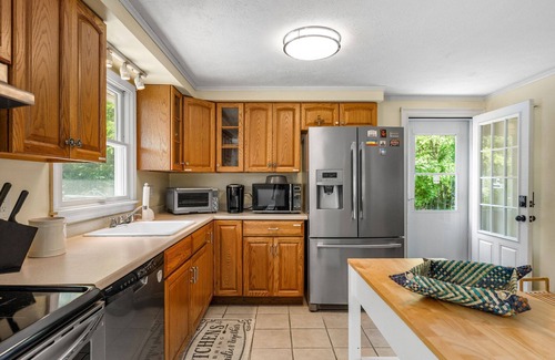 Entering the home you will be welcomed into the fully equipped open concept kitchen with a dishwasher and dining area where friends and family can gather. The dining area has a table that seats six guests with a large slider showing views of the grassy backyard and pool so guests can enjoy the inside and outside all in one! Next to the dining area is a small breakfast table with seating for 2, to have a more intimate dining experience. While dinner is being made, guests can enjoy the main living room off of the kitchen/dining and still keep the conversation flowing.