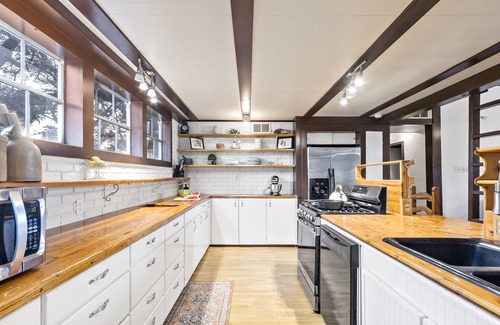 Nestled amidst majestic 100+ year-old oak trees, our rustic yet elegant cabin promises tranquility, nature's beauty, and a touch of Texas enchantment. Discover a land where horses graze, deer wander at dawn, and the melodious songs of diverse birds fill the air.