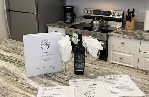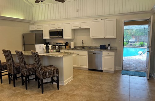 Central Retreat! Centrally located in Ft Myers - only 20 minute to the beach! Heated pool. Outdoor barbecue. Huge backyard! Two kitchens! The main home has 4 bedrooms and 2 bathrooms. The primary bedroom has a king size bed with an ensuite bath, with sliders that open to the pool area. Additional Queen bed in the 2nd bedroom. 4 bunk beds in the 3rd guest bedroom, and 2 twin beds in the 4th bedroom. The Mother-in-Law Suite has one king bed and bathroom with a separate front entrance. The Mother in law suite has a spacious living room, with access to the pool from the kitchen or from the bathroom. The kitchens are well stocked with gorgeous granite counter tops and new appliances. Laundry room has a washer and dryer.