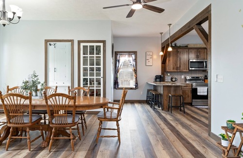 The open-concept kitchen is well-equipped for preparing group meals, with ample counter and cupboard space for all your ingredients and supplies. Gather around the oversized farmhouse dining table, which seats 10+ guests, and enjoy meals together in a space designed for connection.