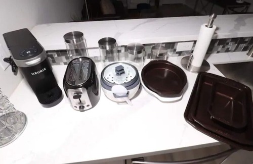 Our beautiful kitchen is well equipped with gorgeous stainless-steel appliances as well as all of the equipment you’ll need to create meals from scratch during your stay. There’s plenty of counter space, and you’ll find pots, pans, dishes, and cutlery in the drawers and cabinets.