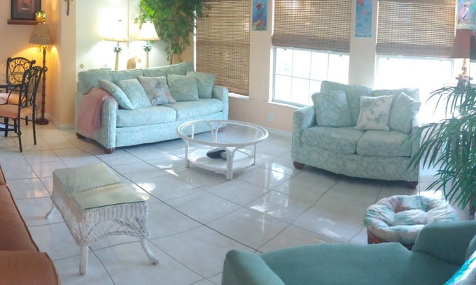 A beautifully decorated, spacious coastal-themed 2300 sq. foot home that backs up to a 354-acre nature park with your private access to enjoy hiking or biking on the trail around the 100-acre lake for fishing. Located within a quiet neighborhood with easy 3.2-mile access to the beach, many local and popular restaurants, and only a short drive to Tampa Bay activities and theme parks like Busch Gardens, Adventure Island WaterPark, Florida Aquarium, ZooTampa at Lowry Park, and the International Shopping Mall. Shopping malls and theaters are less than 10 minutes away. Enjoy evenings watching the sunset over the lake, from the large fenced-in backyard, while grilling or lounging and watching wildlife. The house has a smart Roku TV in each room and a 70" TV in the living space. Free Wi-Fi, a wet bar, indoor and outdoor games for entertainment, and a desk for working vacationers. The master bath includes a sweetheart jacuzzi for two and a walk-in shower. The home has a central UV system to eliminate and prevent contagions or diseases.