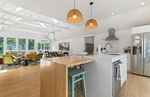 Please take a tour through this breathtaking oasis to familiarize yourself with all the comforts and amenities it offers. The best place to start is the majestic open-concept design living, kitchen and dining area. The home's heartbeat features an entertaining living room with a fully equipped kitchen and an inviting dining area. Warm sunlight touches the elegant décor through windows and skylights, reinforcing the luxurious style under the soaring high ceilings.