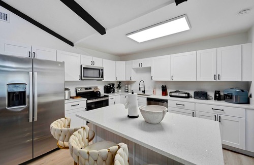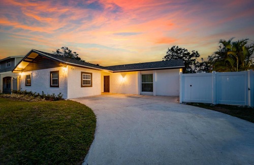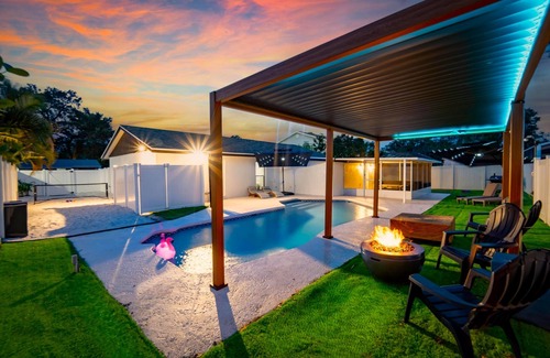 Sleeps 17 people!! Your own Stunning luxury home with its own backyard beach! Resort Style Heated Pool! Poker table, Pickleball, Pool table, Mini Golf, Chess, Dominoes games, Aw did we mention Cornehole and surfboard Bar! Enjoy the Outdoor Gazebo with a Waterfall! OMG! Enjoy West Tampa, the immaculate kitchen, 4 spacious bedrooms, 1 game room, 2 full baths and an outdoor shower, solar heated! Minutes away from downtown, Zoo Tampa, USF, Bush Gardens, Adventure Island, Hyde Park, Raymond James Stadium, Airport, International Mall, Shopping centers, Malls, you will love the conveniency of this location, and all the games, see you soon!