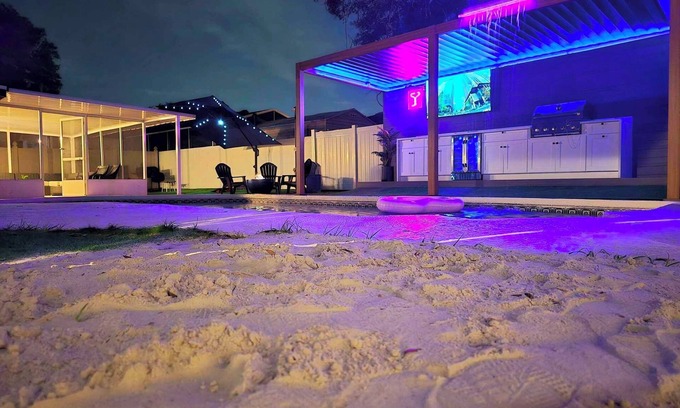Sleeps 17 people!! Your own Stunning luxury home with its own backyard beach! Resort Style Heated Pool! Poker table, Pickleball, Pool table, Mini Golf, Chess, Dominoes games, Aw did we mention Cornehole and surfboard Bar! Enjoy the Outdoor Gazebo with a Waterfall! OMG! Enjoy West Tampa, the immaculate kitchen, 4 spacious bedrooms, 1 game room, 2 full baths and an outdoor shower, solar heated! Minutes away from downtown, Zoo Tampa, USF, Bush Gardens, Adventure Island, Hyde Park, Raymond James Stadium, Airport, International Mall, Shopping centers, Malls, you will love the conveniency of this location, and all the games, see you soon!