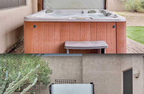 Cave Creek Desert Oasis, located five minutes from North Scottsdale, Arizona, boasts the same lavish amenities offered by our spa resort neighbors here in the desert—think huge rooms, multiple hot tubs, restaurant-worthy, "Climate Controlled" covered outdoor eating areas, one with a Japanese Teppanyaki grilling table, and available services like a personal chef, housekeeping, and a concierge to set up tours and expeditions—while also offering your group an opportunity to connect and rejuvenate in a comfortable, intimate setting in our amazing resort style heated pool, 2 large hot tubs, one extra large 2 person jetted tub in the primary suite, one of a kind back patio and front court yard, outside sunken fireplace all with views of the mountains and the colorful bursting sunsets the Scottsdale desert is so famous for!