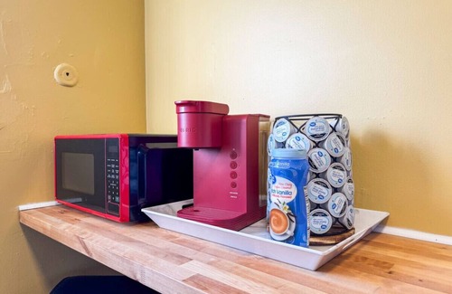 We provide a basic coffee station set up which includes a Kurig coffee machine, coffee pods, sugar and Coffee-mate powdered creamer.