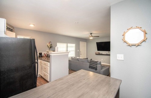 Welcome to a practical and family-friendly 1-bedroom apartment located in a secure, gated complex. The unit features a Queen bed, Full bed, Twin bunk bed, and crib—perfect for families or traveling work crews. The living area includes a Smart TV, sofa, and dining space, while the full kitchen is stocked for extended stays. Enjoy high-speed Wi-Fi, a private bathroom, and easy access to on-site laundry. Just minutes from Downtown, HEB, Home Depot, and major highways. Not a luxury stay, but reliable and affordable.