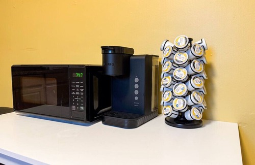 We provide a basic coffee station set up which includes a Kurig coffee machine, coffee pods, sugar and Coffee-mate powdered creamer.