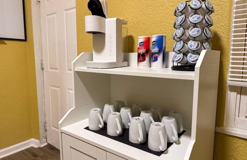 We provide a basic coffee station set up which includes a Kurig coffee machine, coffee pods, sugar and Coffee-mate powdered creamer.
