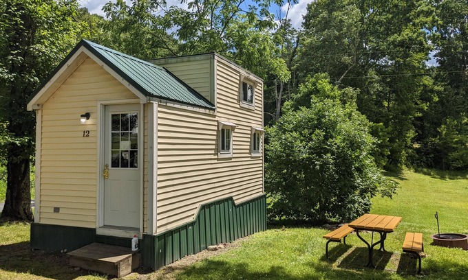 Queen bed is in the loft accessible from a pull down ladder (limited heightin the loft). We always stock our tiny houses with all bed linens, bathroom towels, soap, and toilet paper. The kitchenette has a hot plate, microwave, coffee maker, and a mini refrigerator/freezer. We do supply 1 pot and 1 pan, disposable dishes, utensils, cups, and coffee. There is a television but no satellite or cable TV. Feel free to bring your own DVD player, games, etc. and cords as we do not supply cords for devices. Outside, you have your own picnic table and fire ring. You can cook on the fire ring and later push aside the grate to sit around the fire. Firewood is for sale as well