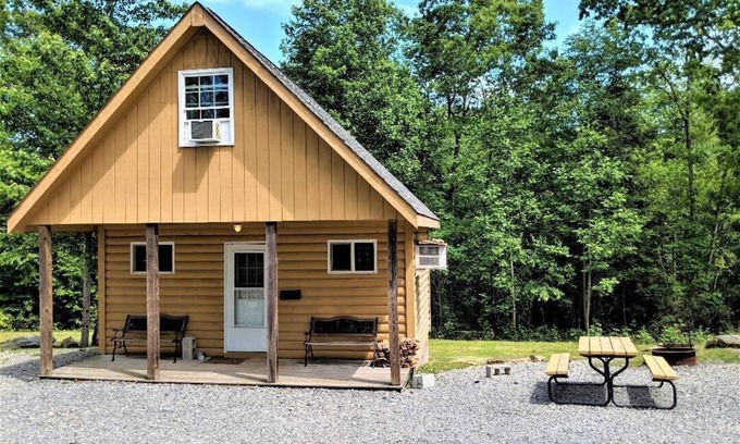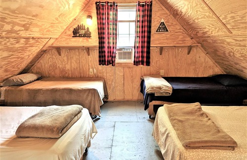 2 twin beds on the first floor, 6 twin beds on the second floor. We always stock our cabins with all bed linens, bathroom towels, soap, and toilet paper. We are also pet friendly. The kitchenette has a two-burner electric stovetop built in, microwave, coffee maker, and a full-size refrigerator/freezer.We supply 2 small pots and 1 smallpan, paper plates, paper bowls, plasticware dishes, plastic cups, coffee and styrofoam coffee cups. There is a television but no satellite or cable TV. Feel free to bring your own DVD player, games, etc. and cords as we do not supply cords for devices. Free basic wifi - however not good for streaming. Outside, there is a covered porch with benches, your own picnic table and fire ring. You can cook on the fire ring and later push aside the grate to sit around the fire. Firewood is for sale on the porch. Guests have access to the parking lot and the yards behind the cabins. Feel free to bring a Frisbee!