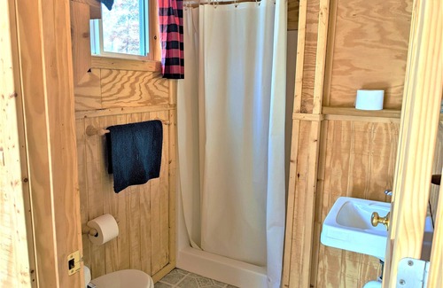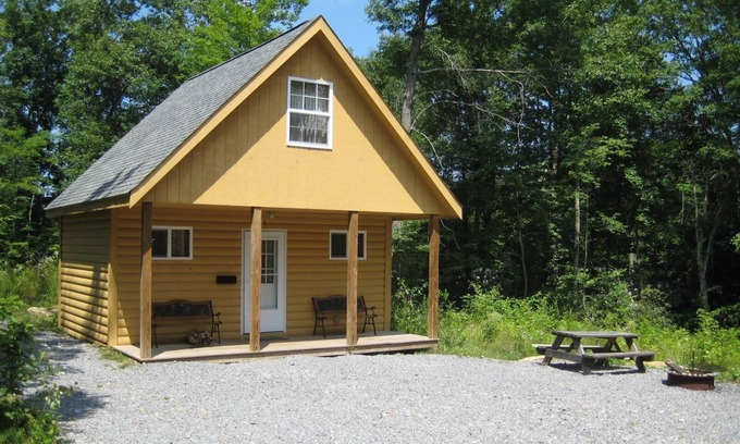 2 twin beds on the first floor, 6 twin beds on the second floor. We always stock our cabins with all bed linens, bathroom towels, soap, and toilet paper. The kitchenette has a two-burner electric stovetop built in, microwave, coffee maker, and a full-size refrigerator/freezer. We supply 2 small pots and 1 smallpan, paper plates, paper bowls, plasticware dishes, plastic cups, coffee and styrofoam coffee cups. There is a television but no satellite or cable TV. Feel free to bring your own DVD player, games, etc. and cords as we do not supply cords for devices. Free basic wifi - not good for streaming however. Outside, there is a covered porch with benches, your own picnic table and fire ring. You can cook on the fire ring and later push aside the grate to sit around the fire. Firewood is for sale on the porch. Guests have access to the parking lot and the yards behind the cabins. Feel free to bring a Frisbee!
