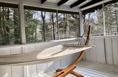 This is a quintessential Catskills Mountain getaway with an open floor plan with vaulted ceilings, and a wood burning stove. Relax in our newly updated bathroom and soaker tub after a long day of hiking on trails or skiing nearby. Upstairs is a lofted room where you can watch a movie on the projector, play a record, find a book, or pick up a guitar to create new memories here at the Slide Mountain Chalet. There’s a front, back and side screened in porch with a hammock for your pleasure.