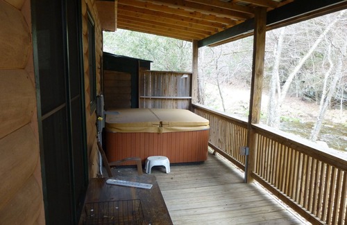 Helton Creek Guest Cabin is a 1 bedroom, 1 bath, 300 sq ft cabin, perfect for a quiet week or weekend on a state maintained trout stream, Helton Creek. Just imagine fishing on the creek, then grilling out or relaxing in the wonderful hot tub while listening to the creek music. The back porch is a stone's throw from the creek. In the winter you can sit in the hot tub and watch the creek go by and in the summer, there is enough shade to relax on the porch and feel the cool breeze, build a fire in the fire pit, or try your luck at catching a nice trout for dinner.