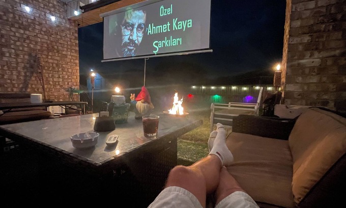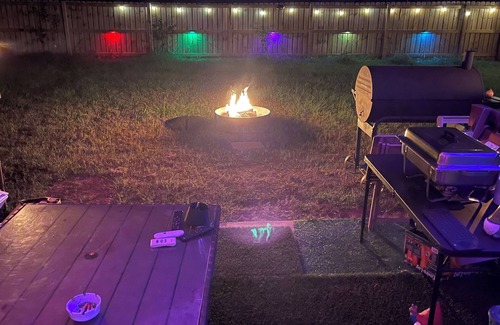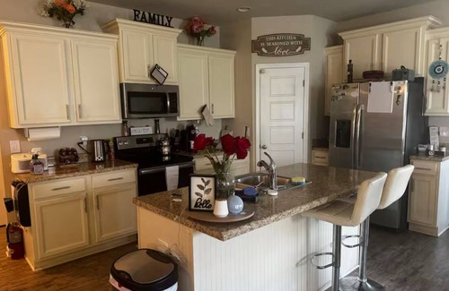 The cozy living room also offers an additional 2 leather sofas for extra comfort. Guests can enjoy amenities like a hair dryer, AC, heating, outdoor projector with 120 inch screen, Grill, fire-pit, 80 inch TV with 5.1 Dolby surround home theater system, lights being controlled by voice during their stay. Make your holiday one for the books with a stay at our place.