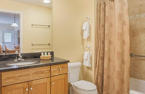 This spacious (1150 sq ft) 2-Bedroom 2 Bath (some with jetted tub) Suite comfortably accommodates 8 guests with a queen bed, a double bed, two (2) twin beds, a full kitchen (including a refrigerator, stove/oven, dishwasher, microwave, coffee pot, toaster, blender, cooking utensils, flatware, and glassware), washer/dryer, fireplace, balcony/patio, stairs, Wi-Fi, television, DVD player, ceiling fan, hairdryer, paper products, dishwashing liquid, dishwasher detergent, laundry detergent and some personal care travel size products.