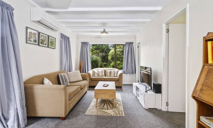 Spend sunny Summer days lounging on the deck at this lovely three-bedroom bach with sea views, nestled in native bush with birdlife abound. This private home sits less than 100-metres walk from the golden sands of Snells Beach. Welcome to Snells Sanctuary!
