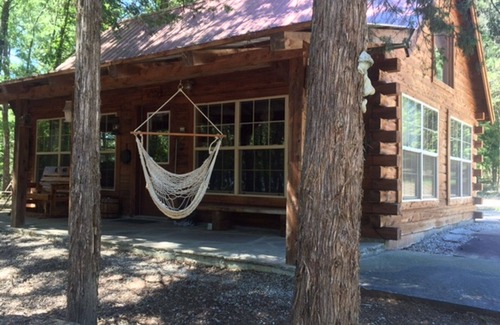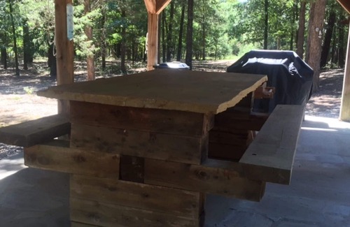 OUTSIDE there is a pavilion that includes a gas grill and a picnic table. A fire pit is next to the pavilion for roasting hot dogs and marshmallows. Front porch includes a cedar rocker swing. Also, there are two hammocks that can be hung between the trees, and one chair hammock that can be hung on the porch.