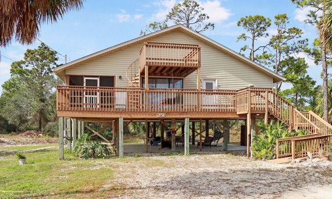 Nestled on the serene south end of Cape San Blas, Blue Moon Cottage offers a charming retreat where the beach is wider and blissfully less crowded. Situated on a secluded street surrounded by lush natural vegetation, this cozy, single-story home provides a tranquil escape with only a handful of neighboring houses. A short stroll will take you to the pristine beach at one end of the road or to the Cape San Blas Smokehouse at the other. While the cottage may not boast a modern facade, its open-concept living, kitchen, and dining area is bathed in natural light through sliding glass doors on two sides, offering easy access to multiple decks. Enjoy leisurely meals on the furnished, screened deck facing the beach, or unwind on the roadside deck, which features both open and covered spaces. A spiral staircase leads to a rooftop sundeck, perfect for soaking up the sun. Pet-friendly and accommodating up to seven guests with its two bedrooms, Blue Moon Cottage is an inviting haven for families and friends alike.