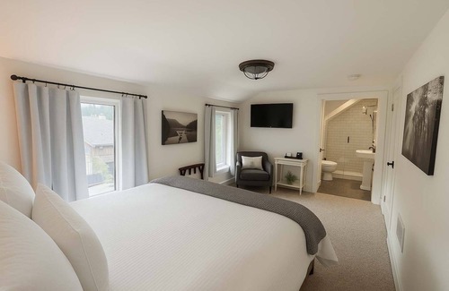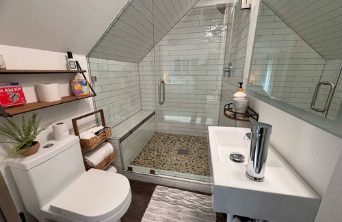 Fir Suite, also known as Suite #3, is a private second-floor micro suite in our beautifully restored 1900s Craftsman home, located just across the alley from the main Snowcreek Suites. Not just a bed and breakfast, the home has been thoughtfully remodeled so each suite includes a private ensuite bathroom. We've enhanced the space with plush beds, elegant décor, a coffee and wine bar, mini fridge, smart TV, strong WiFi, and a cozy seating area. A shared microwave is available at the end of the hallway. You'll also find plenty of off-alley parking behind the property. Just two blocks from downtown Leavenworth, you're steps from shops, dining, and scenic river trails.