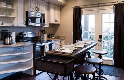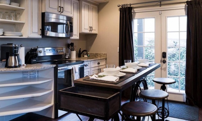 Our Chic Kitchen is equipped with a refrigerator, oven/range, coffee maker, Keurig machine, blender, flatware, crockery, and cookware.