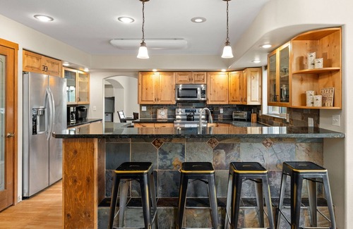The fully stocked kitchen comes equipped with everything you need to cook for a crowd: electric stove, microwave, dishwasher, coffee maker, cookware, dishes, glassware, silverware—and even some essential pantry staples to help you get settled. The kitchen opens into a cozy living space with a smart TV and walk-out deck access. You’ll also find a large dining area nearby, perfect for big family meals or a board game marathon!