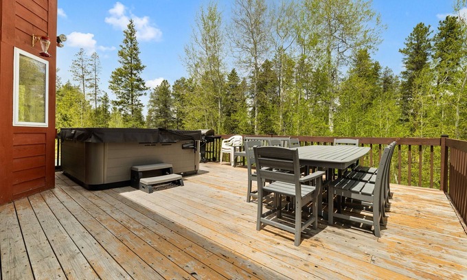 Tucked among serene pine and aspen trees, the home features a patio in the front and spacious deck in the back with a private hot tub, seating areas, and BBQ grill—perfect for summer evenings under the stars. The walkout patio on the lower level overlooks a peaceful meadow and includes covered outdoor seating.