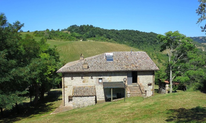 Rustic, simple working farm "Sociano", surrounded by trees, meadows and fields. 4 apartments in the property. 11 km from the centre of Bagnoregio, in a secluded position on top of a hill, 18 km from the lake, in the countryside. For shared use: natural state property 10'000 m2 with meadow, swimming pool (10 x 5 m, depth 80 - 180 cm, seasonal availability: 30.May. - 19.Sep.). WC in the pool area, outdoor shower, barbecue. In the house: lounge with TV, WiFi, billiard table, table football, washing machine (for shared use). 1.5 km long motor access (via unmade road). Parking on the premises. Shop 11 km, grocery 11 km, supermarket 11 km, bus stop 5 km, bathing lake "Lago di Bolsena" 18 km. Nearby attractions: Civita di Bagnoregio 7 km, Bolsena 16 km, Montefiascone 18 km, Orvieto 25 km, Viterbo 30 km. Local sale of farm products. Please note: the owner has a dog. Animals in the neighbourhood. Distance to the pool approx. 300 m.