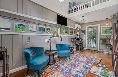 The loft space is accessed by a stationary wooden ladder with sturdy rungs and is designed with a railing for added safety. The loft includes a single twin bed with organic mattress for an additional guest, a large rug for yoga or stretching, and a serene vibe perfect for relaxation. Outside, unwind in the Adirondack chair, soak in the peaceful views of the organic garden, and listen to the gentle sounds of the garden fountain and soft wind chimes swaying in the trees.