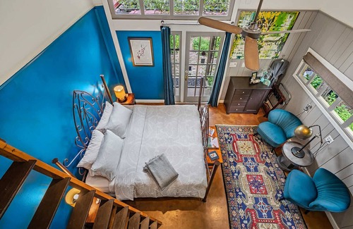 A cozy studio+loft retreat, The Carriage House offers a serene escape with a handcrafted wrought iron organic king-size bed, a loft twin sleeper, and a vintage clawfoot soaking tub. Nestled beside the tranquil mosaic-tiled pool and surrounded by lush organic gardens, this cottage is perfect for a romantic getaway or a peaceful retreat for three.