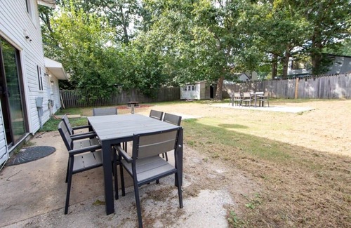 Tucked away in a serene, tree lined street in the beautiful Colony Pines neighborhood. This single family home offers an incredible amount of space with 4 large bedrooms and 2 1/2 bath. The master bedroom has a king bed, bedrooms 2 and 3 with queen beds a twin size bedroom and an Article queen sleeper sofa. Our beds are outfitted with the softest sheets, bathrooms complete with Lather soaps and Chortex towels. Every detail has been accounted for. We welcome long term stays. Come enjoy this perfect family Sojourn.