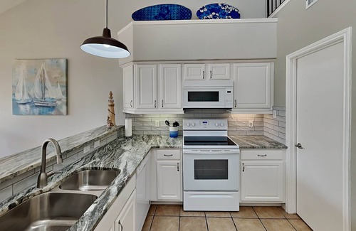 Once inside Sol Searcher, you’ll find an open floor plan with high ceilings and high windows. Prepare a delicious meal in the fully stocked kitchen and then enjoy them in the dining room where the table seats eight guests comfortably. Spend time together in the living room, with plenty of comfortable seating and a flat-screen TV. At the end of the day, enjoy gorgeous Texas Gulf Coast sunsets on your balcony with a cool drink in your hand.
