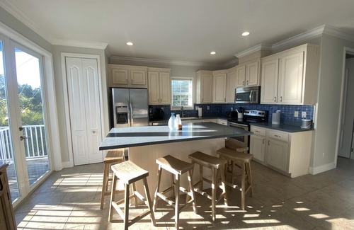 Open concept living with a nicely appointed kitchen with all the appliances and conveniences necessary for a great stay along with a large 8-seat center island for cooking and dining. Entertainment with a 70" TV and bar buffet hosting all the supplies you will need. The downstairs deck also has lovely ocean and sunrise views.