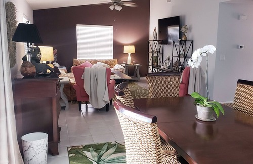 Home with a private heated Pool ! 3 bedroom /2 bathrooms home with screened in pool is on a corner lot right across the street from Lake Lisa Park and playground. As you enter the home, you walk into an open floor plan to see out to the pool. The master bedroom is on one side of the house with a master bathroom. The other two rooms share a bath room, each bedroom has a queen size bed with a trundle bed. Special excursions available by owner! Please inquire!