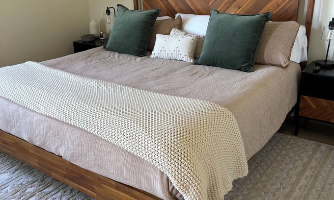 Property has a king size bed with lux linens and two twinXL 6” memory foam floor mattresses that are wonderful for extra guests or children. There is a pack and play available for infants. Linens are provided for all of the extra bed options.