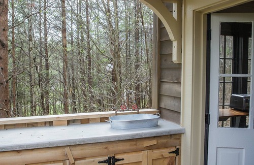 Our own signature Canopy Kitchenette (TM) rounds out the experience. The back porch has a very simple kitchen that includes a stainless wash sink, concrete countertop, toaster, and a gas grill with side burner, all elegantly covered in the shade of an oversized umbrella. Dine upon the custom built-in fold-down table and antique wooden chairs.