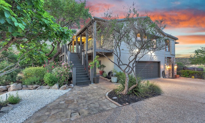 Experience outdoor relaxation in the shaded front garden under a canopy of majestic trees or cool off in the cowboy pool while being surrounded by nature. With the flip of a switch, relax to water cascading down a series of waterfalls running from the top of the property to the lake. With proximity to local gems like Krause Springs, casual and fine dining, wineries, distilleries, the charming town of Marble Falls and with Fredericksburg, Wimberly and downtown Austin 45 minutes to an hour's drive away, your Hill Country resort lifestyle awaits. Embrace this stunning Spicewood retreat – your perfect getaway.