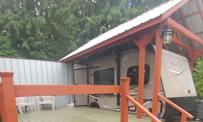 2014 18' Holiday Rambler RV parked under a Roof Structure with attached 16'x12' Deck nestled amongst nature cedar trees on my property semi lakeshore at little white lake in the beautiful Shuswap . Very private and peaceful . The unit has all amenities , a comfortable queen size bed , wifi , and use of a Weber Barbecue on the deck . White lake is a km away and offers great fishing and Shuswap lake is not far and offers all kinds of recreational activities . !xxxxxxx Please note the water supply to the trailer is supplied by a deep artesian well and is high in mineral content including sulfur . Xxxxxx