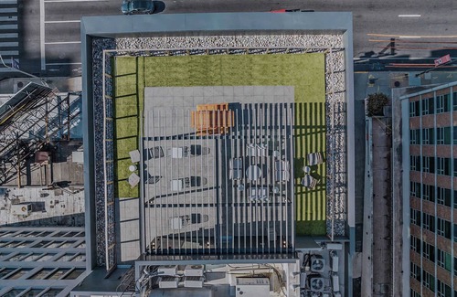 Guests enjoy amenities like a rooftop deck with skyline views, gym, luggage lockers, secure elevator access, and seamless contactless entry.